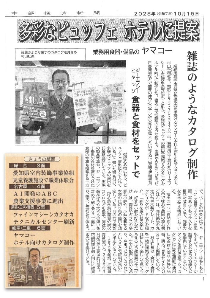中部経済新聞にヤマコーカタログが掲載されました。 2025.10.15 Tweet 中部経済新聞の10月15日号にヤマコーの「演出ビュッフェ」カタログが紹介されました。 雑誌のようなカタログで評判です。 Category:メディア掲載 /blog/blog_comments/captcha/77132123 /blog/blog_comments/get_token